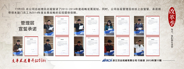 蛇年將逝,馬年將臨。2013年11月2日,浙江漢達機械有限公司的年度戰(zhàn)略會議拉開了帷幕。公司總經(jīng)理斗志激昂,領銜宣讀了2014年年度戰(zhàn)略發(fā)展規(guī)劃。公司的經(jīng)理、車間主任、主管等各級領導們紛紛跟起簽名宣誓。