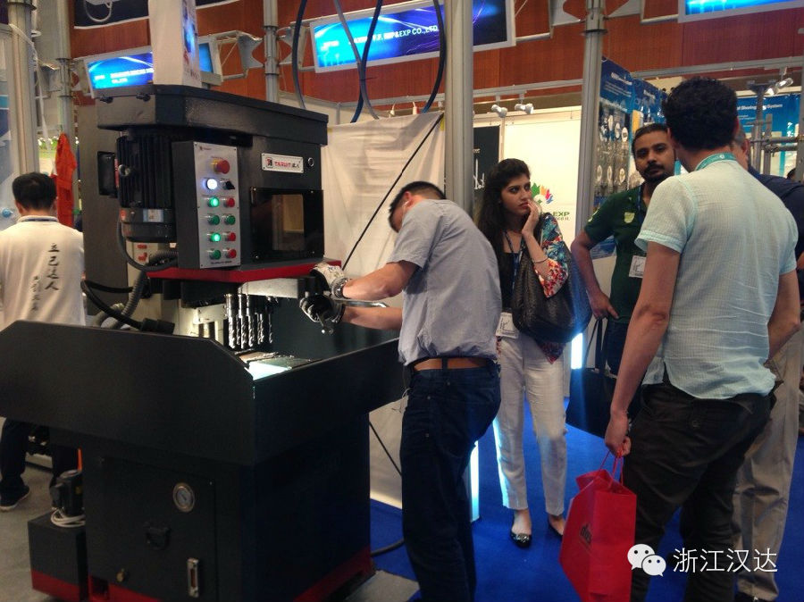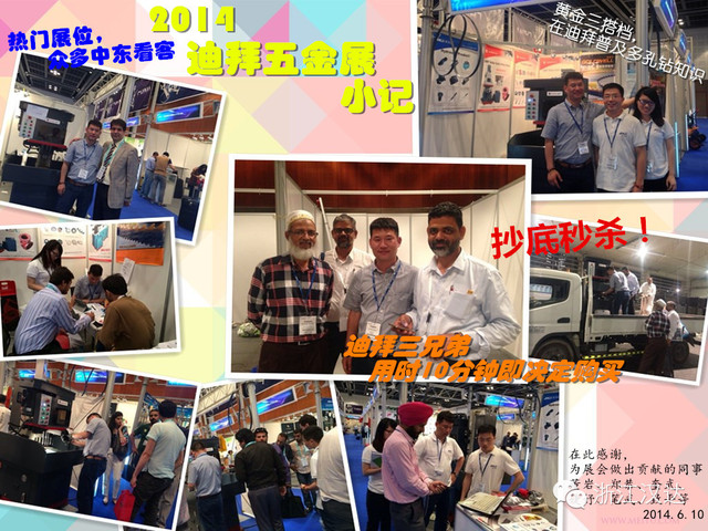 達人多軸鉆床和漢力達液壓,在國內(nèi)受到客戶的喜愛,很多客戶指定要“達人”品牌,“漢力達”品牌。同時,陸續(xù)有一些海外客戶通過網(wǎng)絡(luò)跟我們洽談,出口業(yè)務(wù)也逐步開展起來了。受客戶邀請,我們參加了14年6月份的迪拜五金展,恰逢同期舉辦的汽車配件展,我們的攤位一不小心成為了熱門攤位。