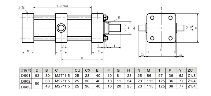 以下為中間銷軸安裝的低壓拉桿液壓缸的尺寸圖及參數。
