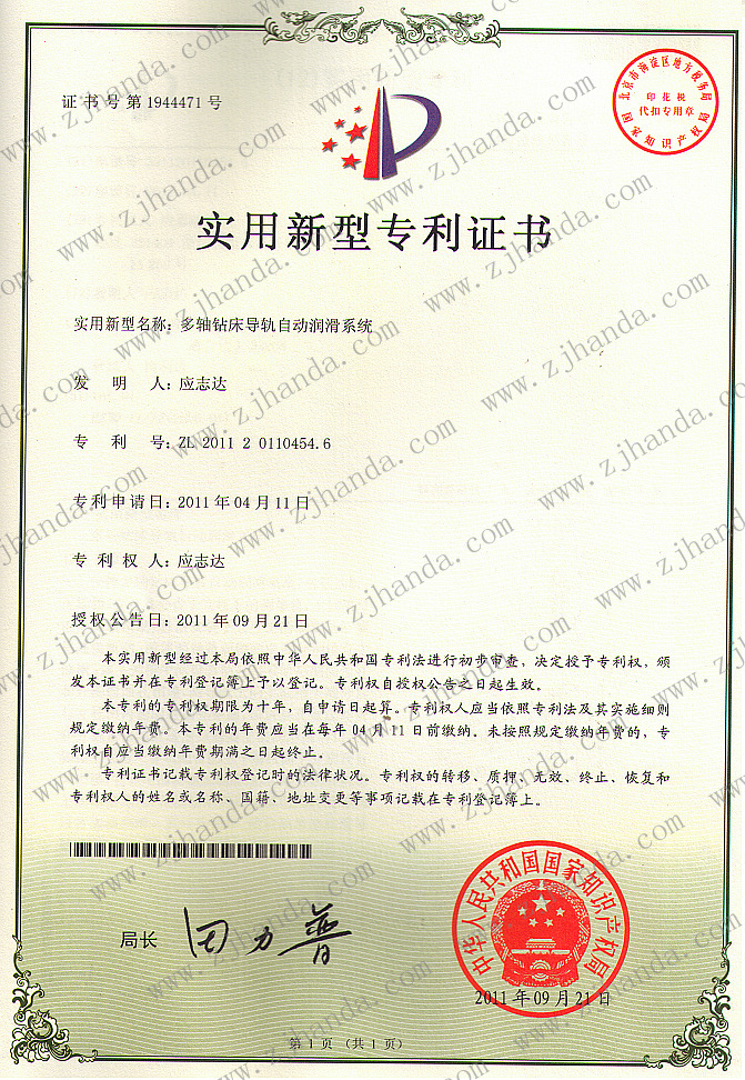 多軸鉆床潤滑系統(tǒng)新型專利證書