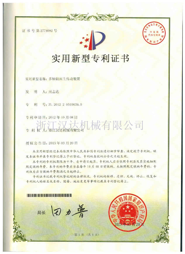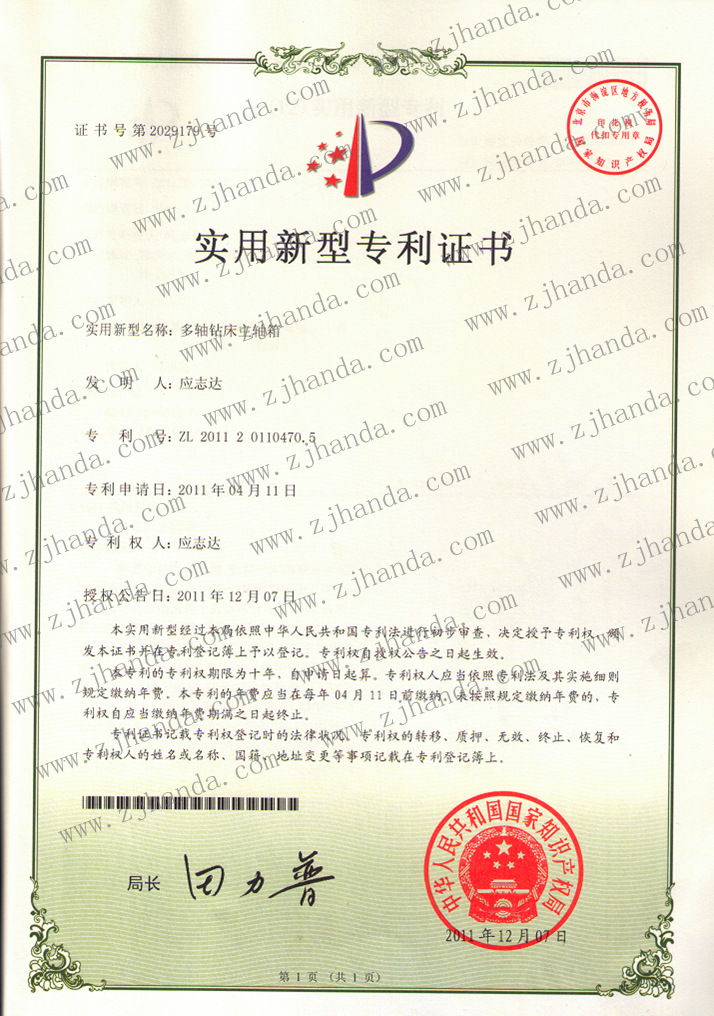 多軸鉆床主軸箱新型專利證書