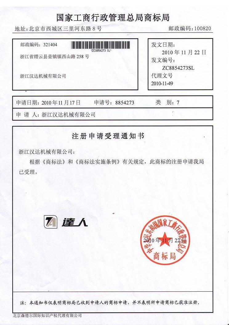 漢力達商標注冊證書