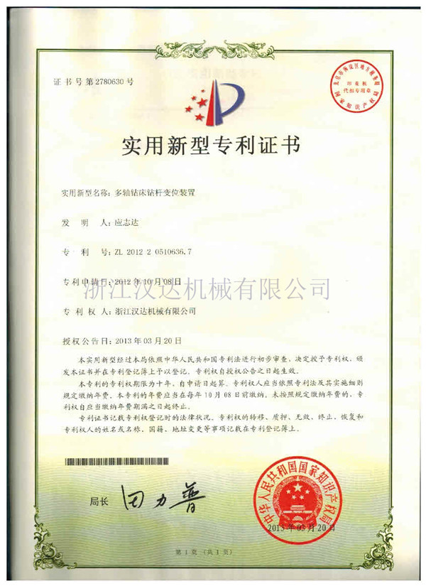 多軸鉆床外觀專利證書