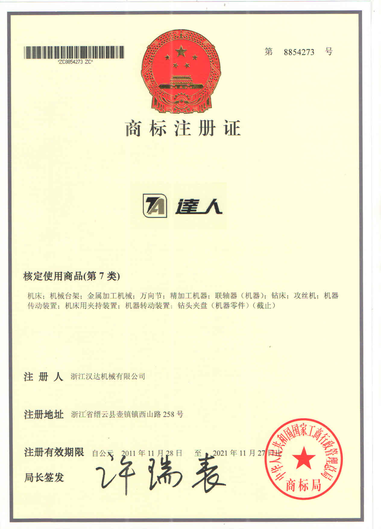 達人商標注冊證書